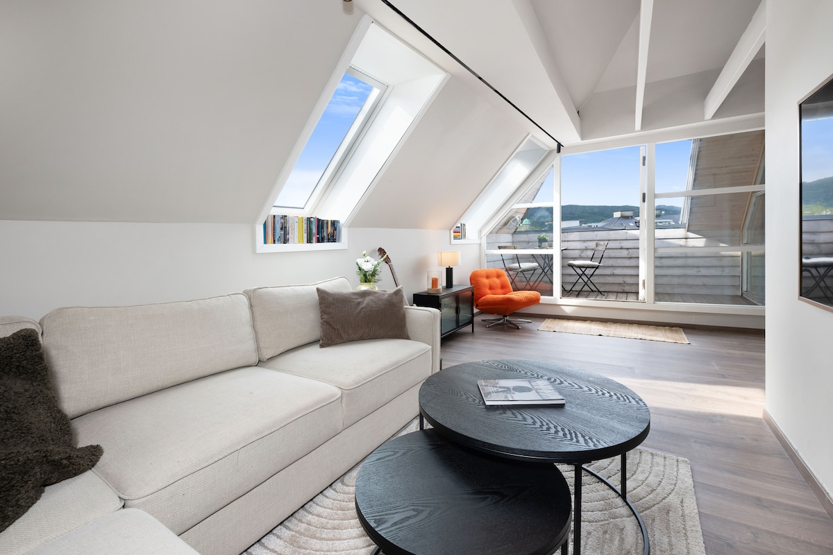 Nice top apartment with high standard on the 6th floor. Nice view, private terrace and large terrace with 360 degree view. Elevator access. Very central location with walking distance to Bryggen, restaurants, pub, museum, park, beach. Immediate proximity to the train station. Bergen light rail with direct access from the airport. Grocery store in the neighboring building. 50 meters to the nearest parking lot and 300 meters to the parking garage. Good layout with 2 bedrooms and 2 bathrooms! Washing machine and dryer for free use.