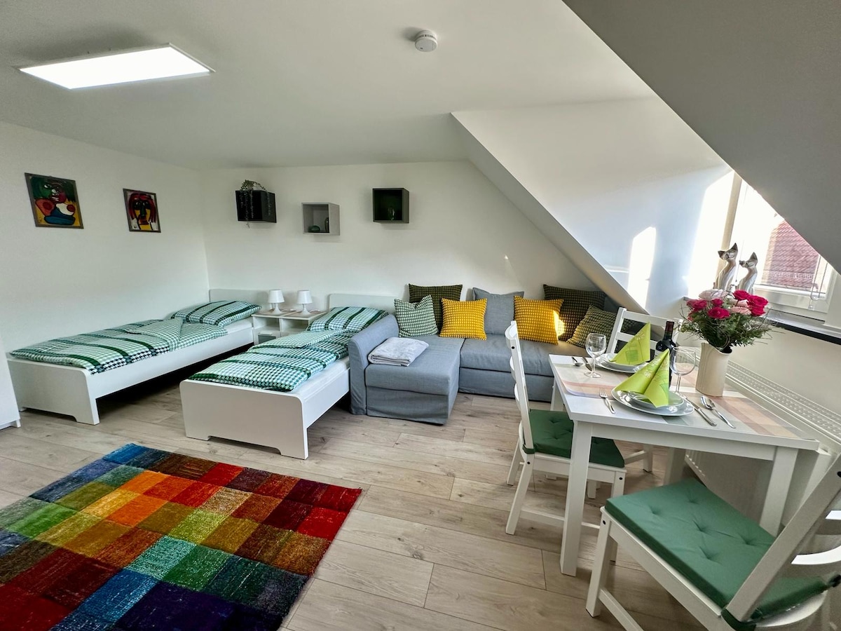 We rent our 77 sqm fully furnished 3-room apartment in Burkardroth, which is located on our 1200 sqm property in an annex with a separate entrance. max. 5 people: - larger bedroom: 2 × 1 m double bed - smaller bedroom: Single bed with another pull-out single bed - Living room: sofa bed - The kitchen is on the ground floor, the living/bedrooms and bathroom are accessible via steps. Attention: now also with Wi-Fi and smart TV!
