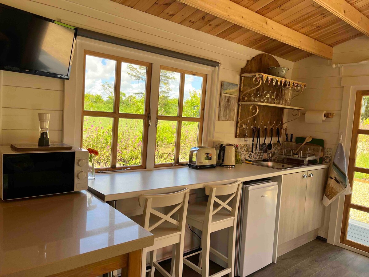 A self contained garage conversion comprising of - Bedroom (double bed), bathroom, cosy living space with log burner. Kitchen area with hob (NO OVEN), Air fryer, fridge, kettle and microwave. Tea/coffee/milk and some breakfast items (bread/cereals) are provided. As are towels and bedding, toilet roll & hand soap. Outside sitting area with countryside views. 5 minutes walk to coast path. Quaint village pub with beautiful sea views within walking distance. Unfortunately we do not allow any pets.