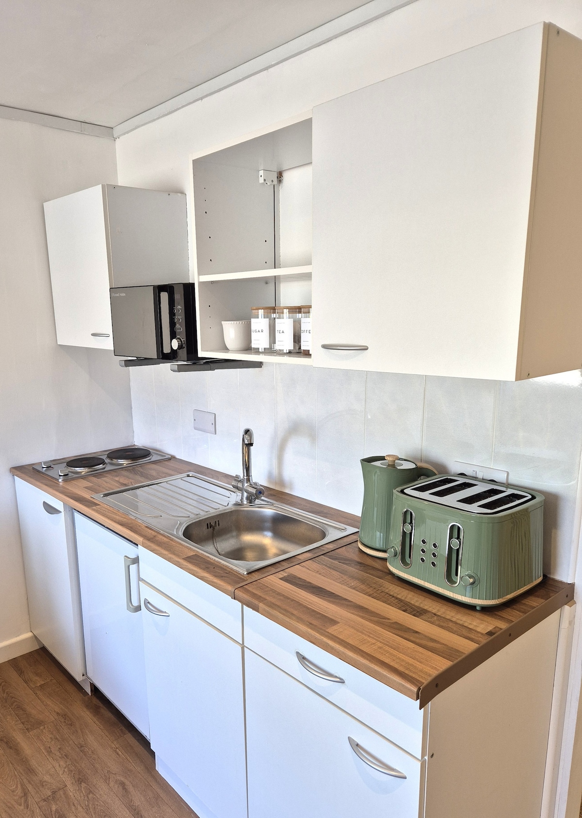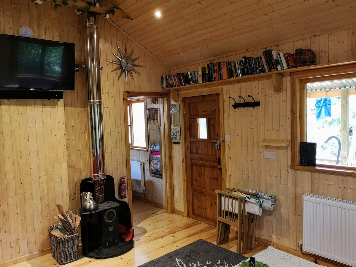 Our cottage is a quirky wooden framed, tin clad cottage, sitting on the banks of a stream, next to our house. Although small it feels much bigger with a fully equipped kitchen, bedroom and bathroom. It can sleep 4 people with the use of the sofa bed. It features a wood burning stove, (it also has central heating ;-)), a gorgeous mural across one wall, a veranda for sitting and watching the world go by, oh and it also has full WiFi, smart TV and sound system if this all sounds a little rustic.