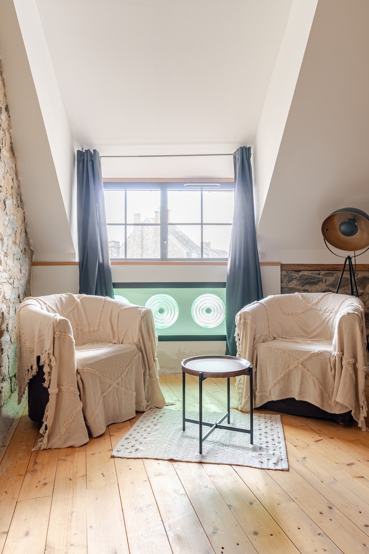 "Atout de suite", c'est votre pied-à-terre intime et chaleureux, situé au cœur d'un village médiéval mondialement connu pour sa fonderie de cloche. Découvrez une suite atypique, équipée de son propre spa pour un moment de détente et de romantisme. Accessible par une rue piétonne pour plus de charme et d'intimité, idéale pour un week end en amoureux, à 40 min du Mont-Saint-Michel.