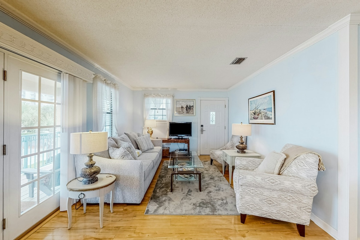 Sandestin Resort open-concept bright & wide single story duplex condo perfect for 4-6 adults and/or families...will sleep 8 w/sofa sleeper and 1 set of bunkies. Please note 2nd BR has 2 twin EXTRA LONG (80"/same as king) beds with private entrance to 2nd BA. Kitchen has granite and stainless steel appliances. Refrigerator has filtered water which tastes great. Golf cart seats 6 or fold down back seat to cart chairs to beach in provided tub. Condo located in secure area...tons of amenities.