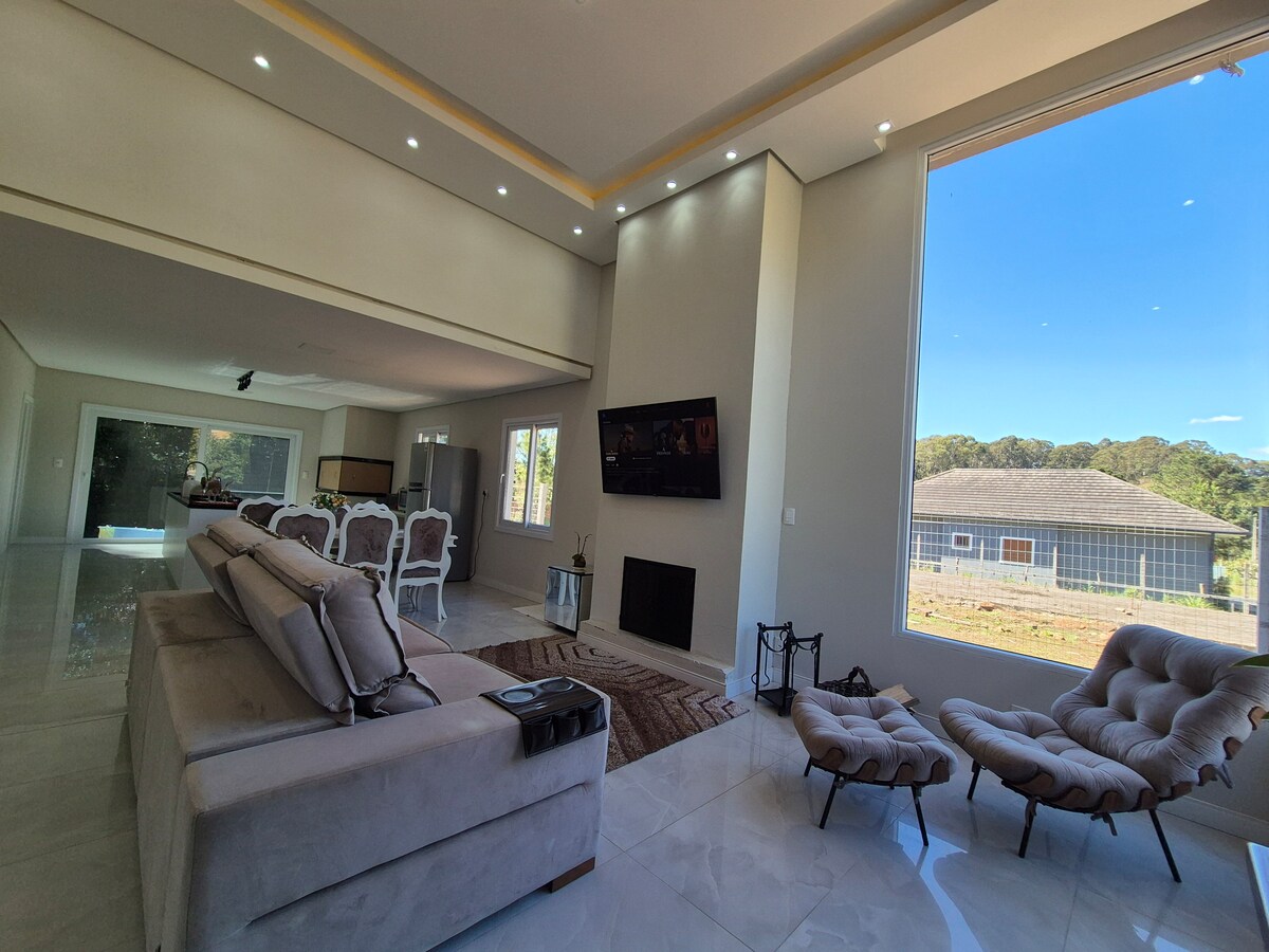 Beautiful and new house in a condominium, 10 minutes from the center of Gramado and 2 minutes from the center of Canela. House fully equipped with everything you need for a great stay (Smart TVs, air-conditioners, utensils, barbecue, ecological fireplace, electric heater, appliances, shower and faucets with gas heating, bed and bath linens, etc.). The house is in a beautiful, safe, quiet condominium with easy access to the main tourist landmarks and attractions of Canela and Gramado.