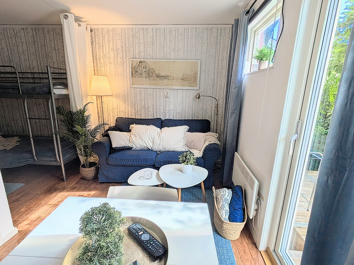 Kom och bo i denna moderna och mysiga lägenhet på bottenplan, med bekvämt cykelavstånd till Visby innerstad! - 32 m2, egen ingång - Badrum m. klinkergolv, duschkabin, WC, tvättmaskin - Fullt utrustat kök m. kyl/frys, spis/ugn och husgeråd - En 180-säng och en bäddsoffa (120 cm) - TV, WiFi - P-plats ingår - Djur är välkomna! - 4,5 km till centrum Lägenheten ligger på bottenplan i ett ombyggt garage, i ett lugnt villaområde nära naturen. Vi som hyr ut är dina grannar och finns tillgängliga!