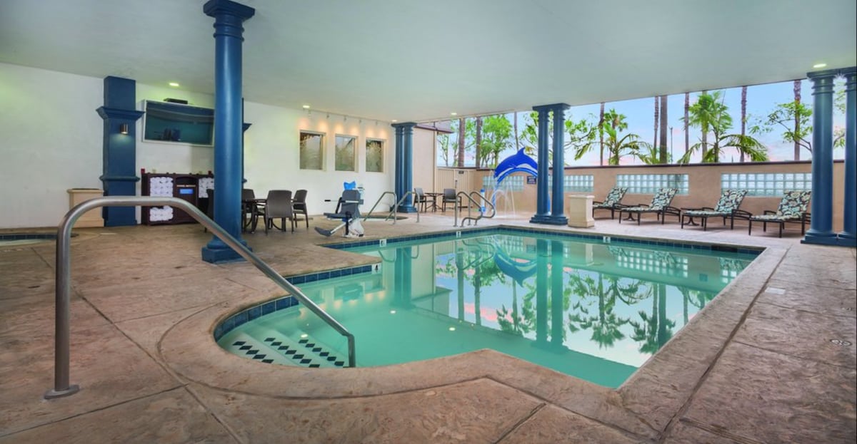Welcome to our cozy 2BR Suite at Wyndham Dolphin's Cove, the perfect home away from home for your Anaheim vacation! Our spacious suite features a comfortable living room with a queen-size sleeper sofa, and a fully equipped kitchen for your convenience. You'll also enjoy access to resort amenities including a swimming pool, hot tub, and fitness center. Plus, our location is just 1 mile from Disneyland and within walking distance of great dining and shopping.