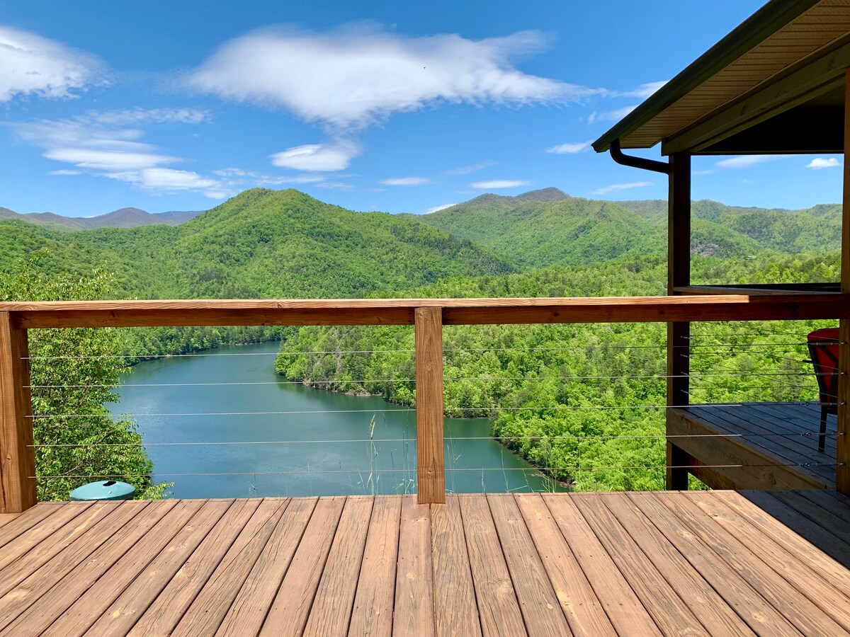 A truly unique cabin with a wall of windows giving you spectacular views of Fontana Lake and the Great Smokey Mountains National Park whether you are in the living room, kitchen, or dining room, or even upstairs playing pool. This cabin also has a long-paved driveway that is perfect for your cars or motorcycles. You can spend all your time relaxing at the cabin however, you are only 10 minutes to Tsali or the Nantahala Outdoor Center and only 15 minutes to Bryson City.