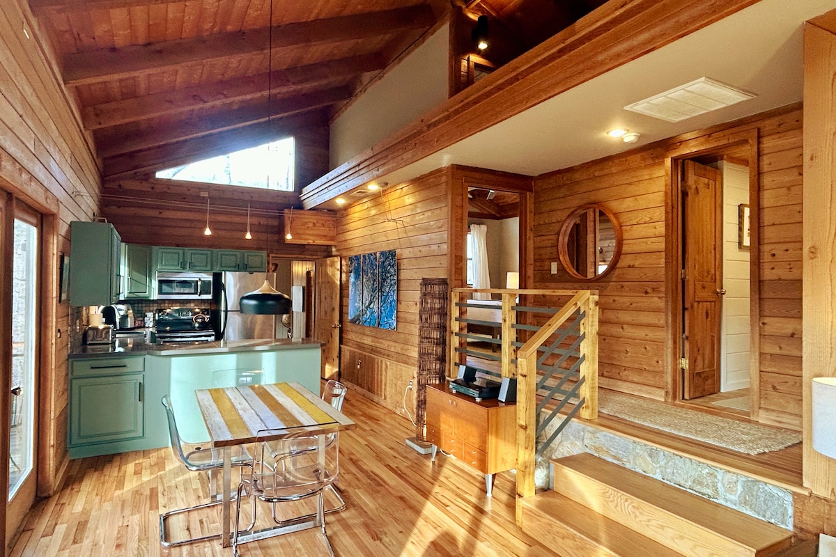 Flooded with light and an open floor plan, this cozy and comfortable mountain home is the perfect landing spot for your outdoor adventures. Unexpectedly inspired by mid-century decor this home is not your typical mountain cabin. As one of the few rentals with a fenced in yard, you and your four legged family will enjoy the security and freedom to do-as-you-please. The hot tub, outdoor firepit, grill, and spacious deck set the tone for stargazing and enjoying nature. Relax, unwind, enjoy!
