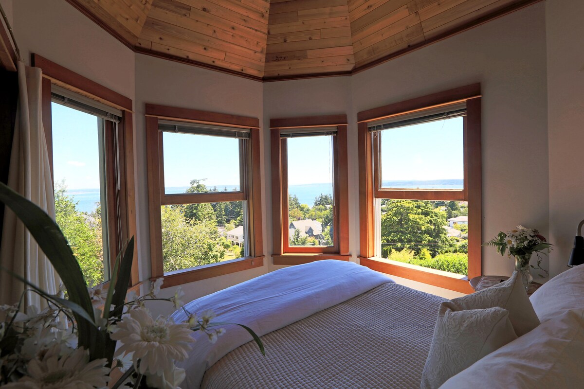 This unique private penthouse suite has won awards as a romantic getaway. The tree house feeling bedroom is in a turreted tower. Snuggle in a feather topper mattress watching the sunrises over the water, Cascade Mountains and Olympic range. The double-sided tub soaks two. Includes kitchenette, ground coffee and a cozy sitting room with walkout skylights. The window seat offers an additional place to sleep. Upgrades include champagne, roses, bath salts, massage oils. Just ask!