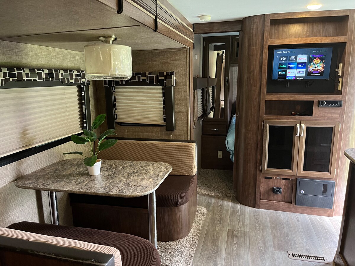 Backyard Glamping! Perfect for couples or solo travelers. This modern camper has all the amenities needed for a comfortable stay away from home. Features rear corner bunk beds with storage, a Queen bed with an overhead cabinet, and a booth dinette that converts to a sleeping space. A modern kitchen with everything you need to dine in! Please note the gas stove and oven have been disabled for safety, replaced with an induction cooktop. Great Monthly Rates Available!