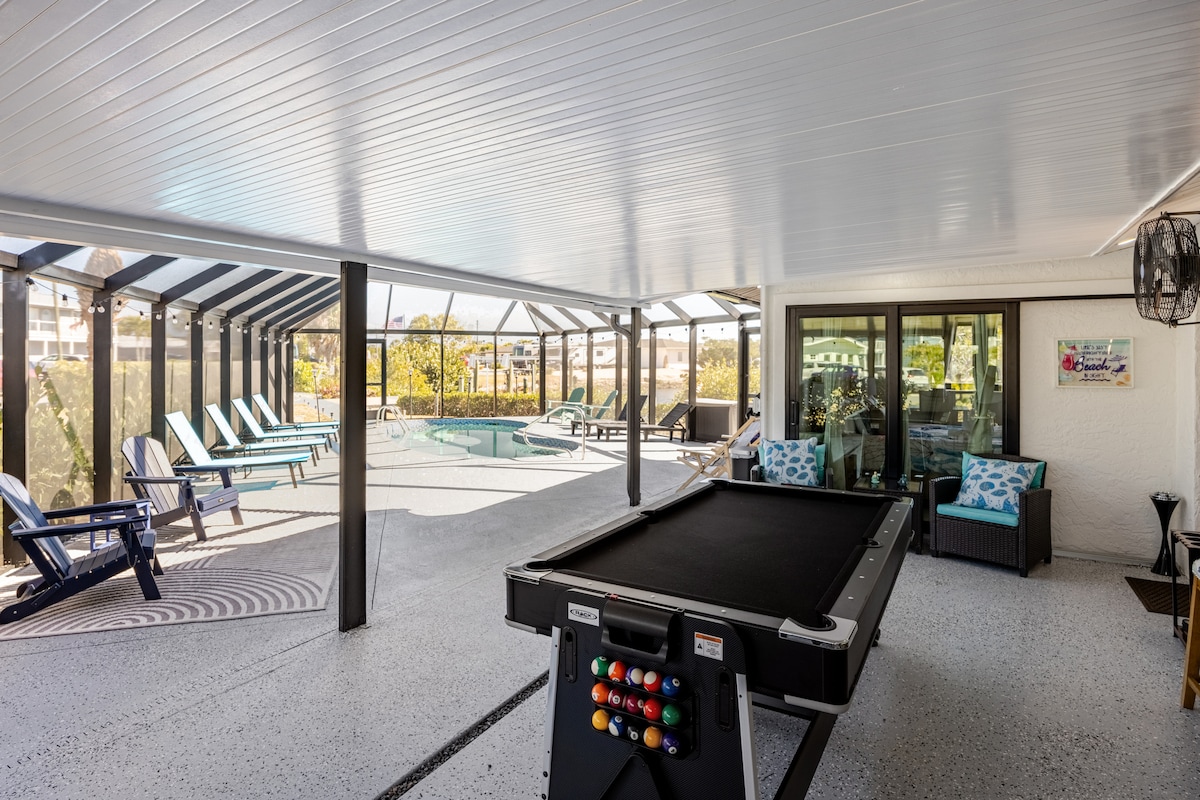 Luxury waterfront retreat in Fort Myers Beach! This coastal-chic home comfortably accommodates 12+ guests and features a heated private pool, fire pit, BBQ, game room with billiards, ping pong & air hockey, plus a coffee bar. Enjoy direct Gulf access with a private dock — even yacht pickup from the house. Ideal for families, groups, and private events. Optional concierge services available.