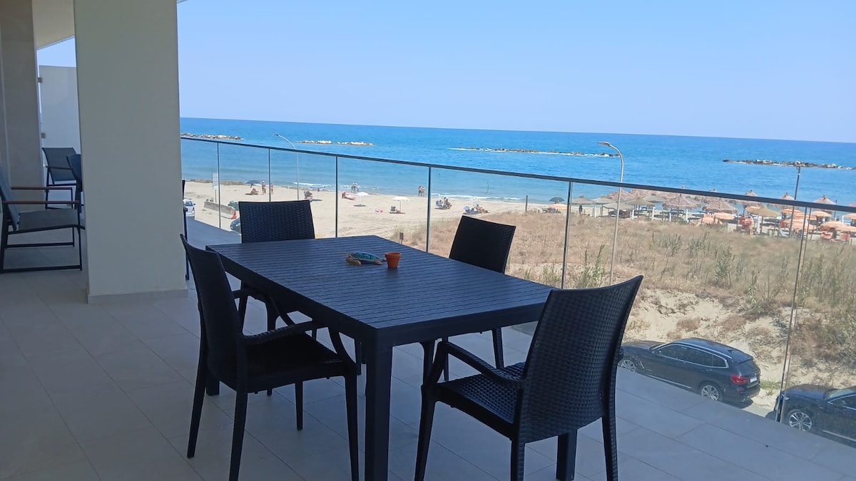 Beautiful, newly renovated beachfront apartment located on the second floor of a residence on the north waterfront in front of the seaside. The apartment consists of a double bedroom with sea view and a second bedroom with a french bed. The living area has a sofa bed and a fully equipped kitchen. You can enjoy an umbrella provided to access the free beach in front of the residence