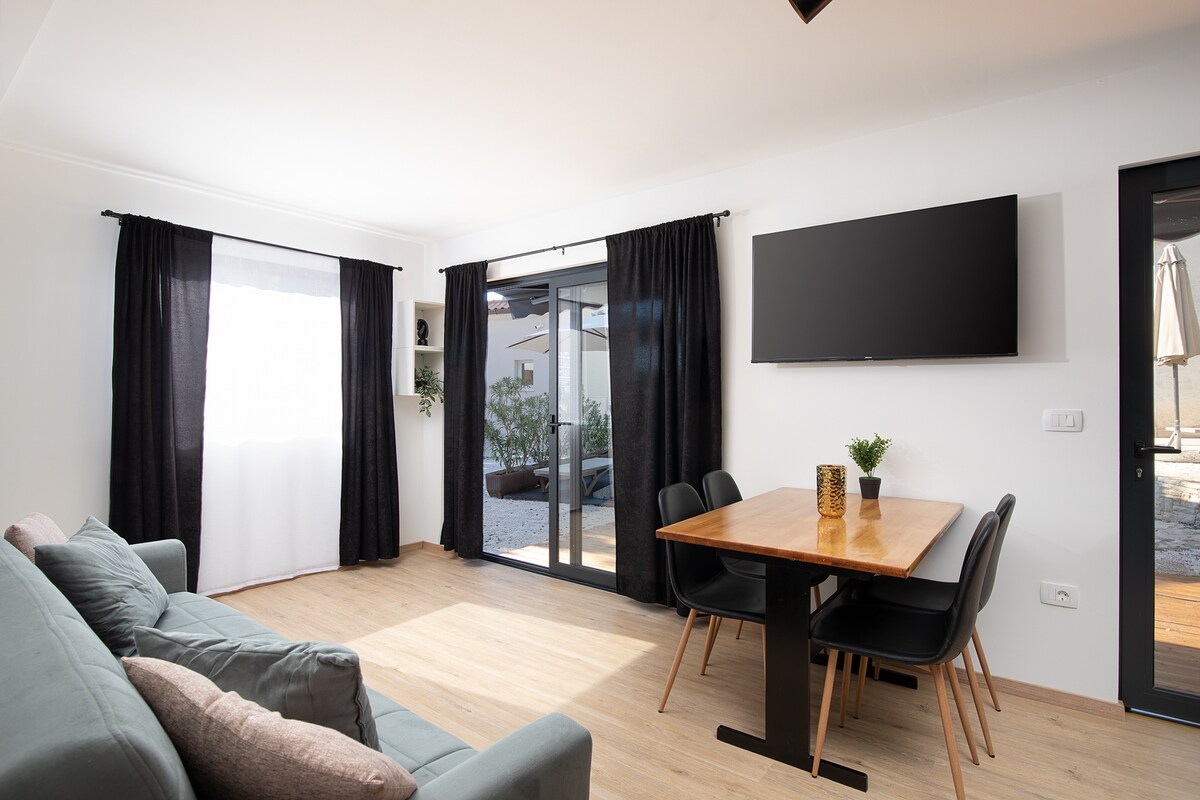 Ovaj jedinstveni smještaj uređen je u nesvakidašnjem stilu. Gostima na raspolaganje nudi potpuno opremljenu kuhinju s perilicom suđa i pećnicom. Prostrani dnevni boravak sa smart tv-om, moderno opremljenu kupaonicu, te izuzetno udobnu spavaću sobu. Gostima je na raspolaganju privatni grijani jacuzzi za 2 osobe. Prva plaža udaljena je svega 10 minuta hoda. Kućni ljubimci su dopušteni.