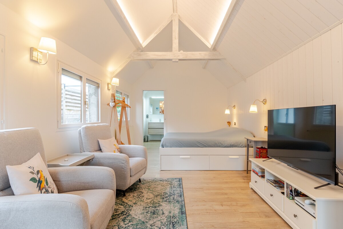 We will welcome you with ease, next to our home, in a modern studio, set back from the street, for a quiet stay. There is an equipped kitchen, a comfortable 160 x 200 bed, a walk-in shower, and separate toilet. You can stroll in the garden of about 300 m2, which I converted into a mini-garden Edible Forest. And for even more fun, I can offer you a breakfast basket to enjoy the moment even more!