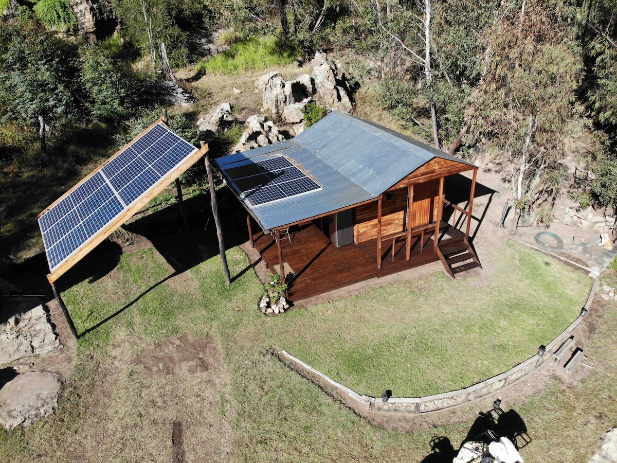 Experience the outdoors without the hassle of setting up a tent. Our cabin is 100% off the grid running off solar for power and borehole water. Enjoy walking and cycling trails, fishing on the dam or taking your off rd motor bike for an adventure. Horse riding is available on the farm next door.