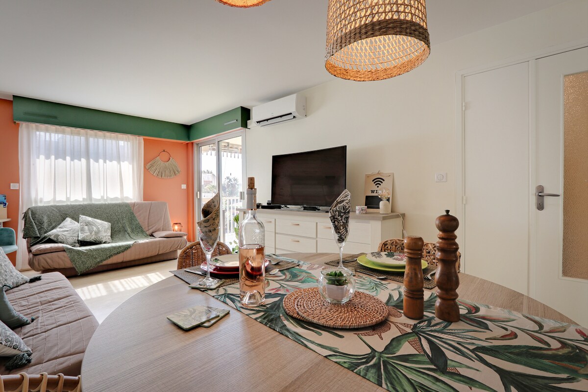 Logement 44 m2 tout confort dans Résidence standing face au port de plaisance, commerces et restaurants : tout à pied ! Centre ville 1,5 km, Plages 1 km, criques 7 mn à pied. Parking privé, piscine, grande terrasse S/E , vue mer, au calme. Local vélos. Gardien vigilant Lumineux, climatisé (réversible), décoration chaleureuse, soignée et tendance où rien ne manque. Séjour, cuisine et chambre avec accès direct sur la terrasse. Lit queen size. Nombreux placards. WC indépendant. Internet fibre.