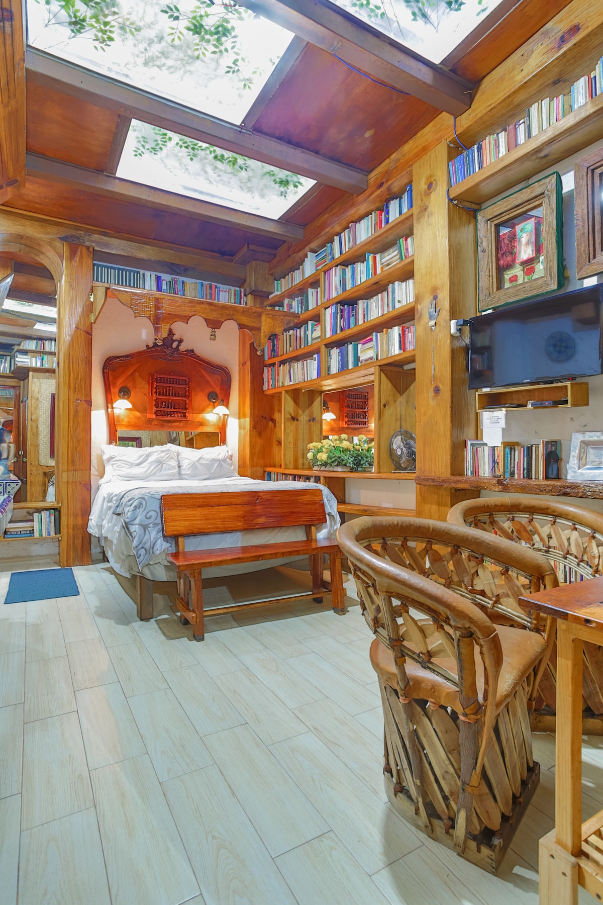 Welcome to La Biblioteca, a 22 m² suite, which is part of the seven suites of the iconic El Guajolote house in Coyoacán. 📍 Steps from Frida Kahlo's House and Plaza de Coyoacán. Private 🔐 spaces: kitchen, private bathroom and living area. 🛏️ Double bed. ✍️ Ideal for couples, writers or nomads. 🌿 Tranquility and authenticity of the neighborhood.