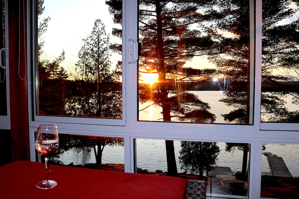 A cozy lake waterfront cottage with a magnificent view on 1 acre of land. Enjoy beautiful sunrises while sipping a cup of coffee. Play giant connect four. Roast marshmallows by the firepit. Indulge in peace & serenity. The lake is excellent for fishing, kayaking & canoeing. 15 min from amenities. 30 min from attractions, including alpaca farms, 1000 islands, Prince Edward County wineries, old Kingston downtown, Lavender Queen Farm, Fort Henry National Historic Site & star gazing in Stone Mills.