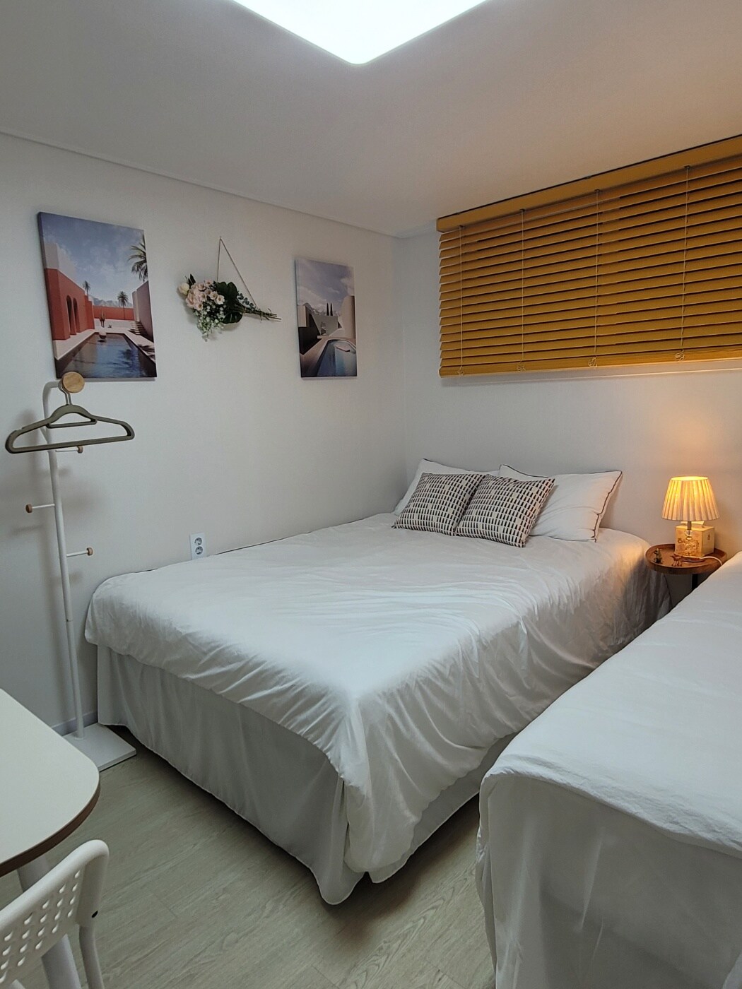 Hi, this is J-STAY.🥰 ☆ We decorated it with white bedding and handmade fabric accessories on a white basic base, with care and without clutter. Up to 5 people can stay. It is suitable for long-term stays without any shortcomings. ★ It is a semi-basement with two small stairs from the gate, but it is newly decorated and has a yard in front of the accommodation, so it is a neat accommodation with good daylight and ventilation. ☆ It is a quiet residential area, and there are 2 parks near the house, so you can take a leisurely stroll and relax.