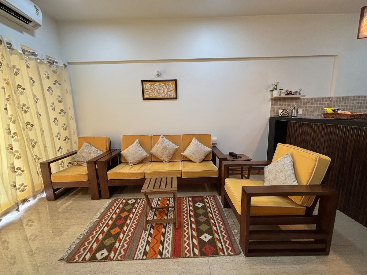 Wifi Enabled - Well furnished, spacious 600 Sq. ft 1 BHK around a golf course. Apartment faces the Golf Course, Palm Deck, Resort & Pool - a view from each of the rooms. The well-appointed experience with amenities including a well-equipped kitchen with basic needs like tea/coffee, silverware. 9 hole, par 27 Golf course within the property is accessible to guests on pay and play basis. Non Golfers can enjoy the walk around the course and the riverside promenade