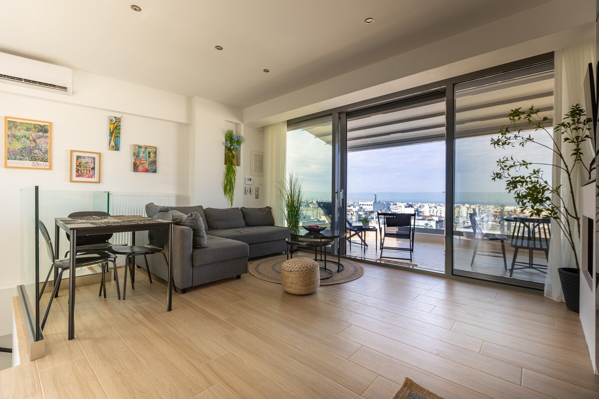 Unique 1 Bedroom fully equipped apartment on the seventh floor of a 2020 renovated building with a breathtaking terrace balcony. High speed internet, premium amenities, a luxurious queen size bed, and your very own Netflix account are but a few things we offer you. Luminous, spacious, with everything you might require to enjoy your stay in the heart of Thessaloniki's social life, only 5 minutes away from Aristotelous square and 2 minutes from the seafront. Welcome and enjoy your stay!
