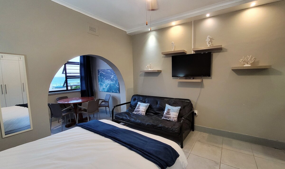 Have a cup of coffee while staring at the ocean from the dining room. A quaint bachelor unit on the doorstep of Uvongo Beach, this unit offers guests a swimming pool, 2 communal braai (bbq) areas and a kids' play area. There is easy access to Uvongo Beach via a gate and pathway that leads directly to the beach. The unit is equipped with a kitchen, a modern bathroom, Netflix, Disney and DStv (log into own accounts), MyFamilyCinema and free wifi. Linen provided. Bring your own towels.