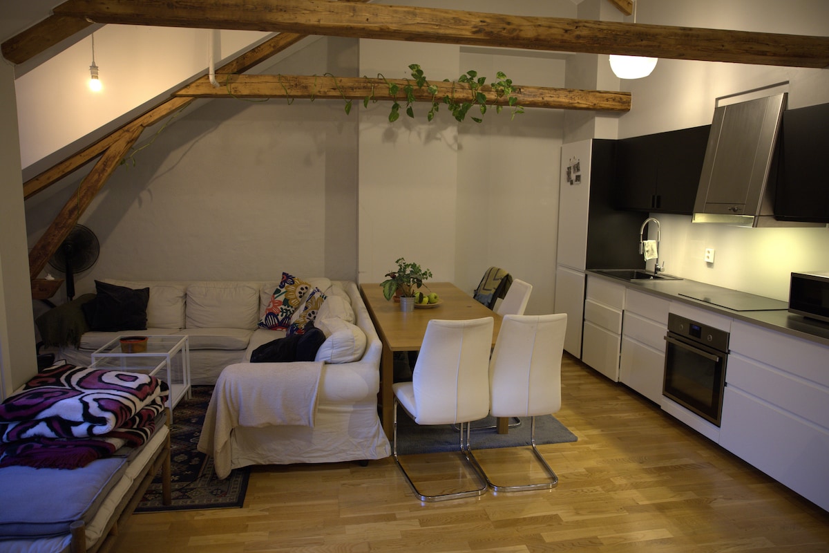 Leiligheten er et romslig loft. Her er detaljene designet av nordiske arkitekter, i en skandinavisk stil for koselige kvelder og arbeid. Stuen er stor og luftig med sofa og spiseplass. Her er det loftsvinduer og autentisk treverk i taket og heltre gulv. Soverommet er romslig med en stor komfortabel seng og en praktisk kjøkkenkrok. Alt du trenger skal være tilgjengelig :) Arbeidsrommet er godt designet for fokusert arbeid med bærbar pc eller lesing. Bøker tilgjengelig for å lese. Velkommen!