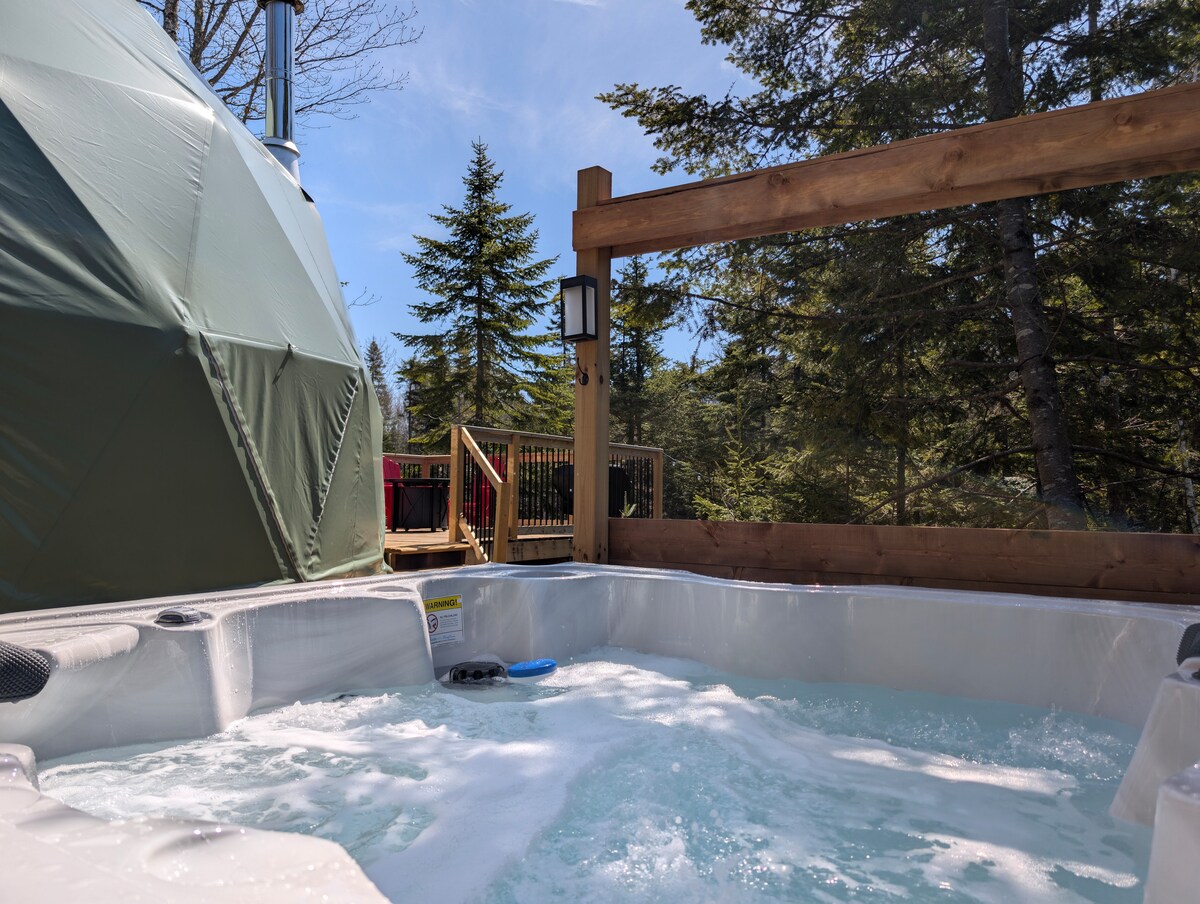 We offer one night stays! Enjoy stunning panoramic sunset views of the beautiful Belleisle Bay in the Star Dome; situated in a natural meadow near the lodge building. The Star Dome provides a unique experience with propane fireplace, and a clear roof for star gazing. The outdoor viewing deck includes a kitchen with all utensils/ hot sink, hot shower, toilet and BBQ. Round out your relaxation with our Finnish wood-stove sauna and cold tub at $50 per hour.