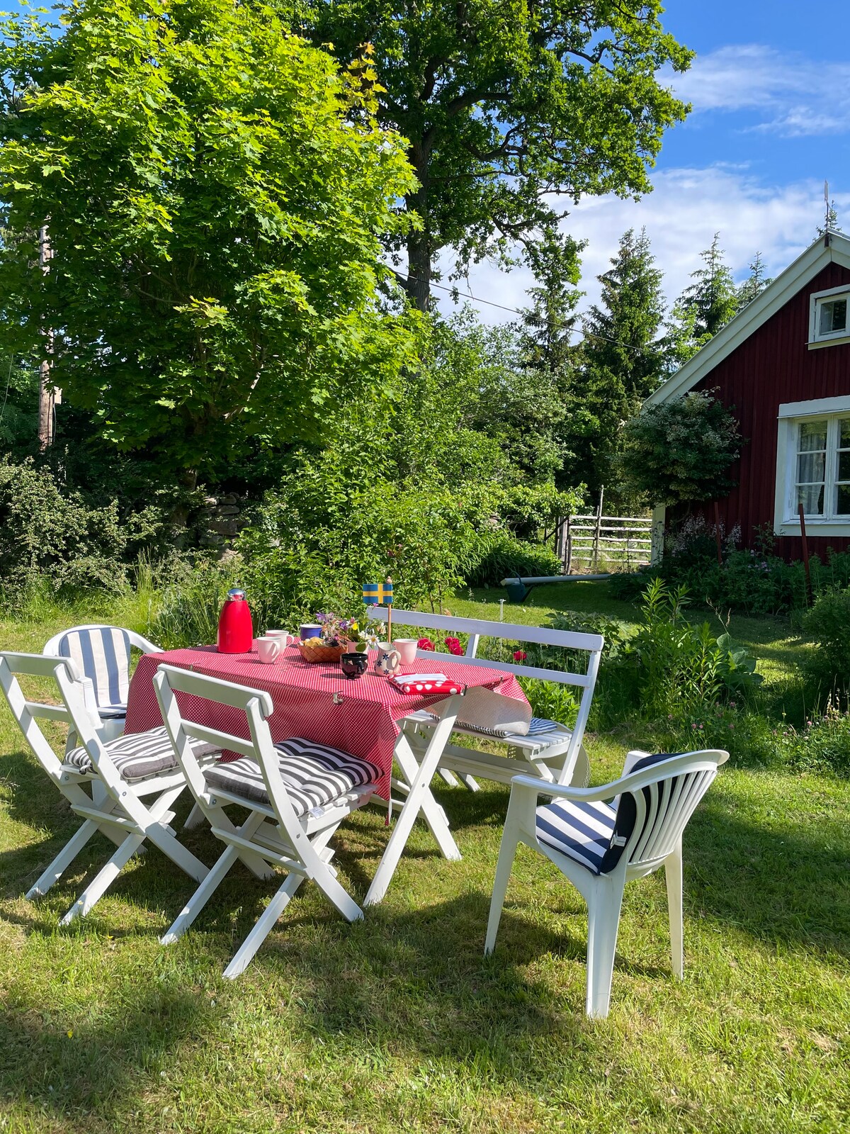 A small guest house with room for 4 people, located on the country side. Kitchen, fridge, freezer, coffee machine, toaster, stove, toilett, Tv, dvd, play station 3.....if you can not find the second bed room... look again and it helps if you have seen the movie Narnia :)....There is no shower in the guest house, but an out door shower in the garden… also no wi-fi in the guest house. A peaceful and quiet environment in middle of the nature....