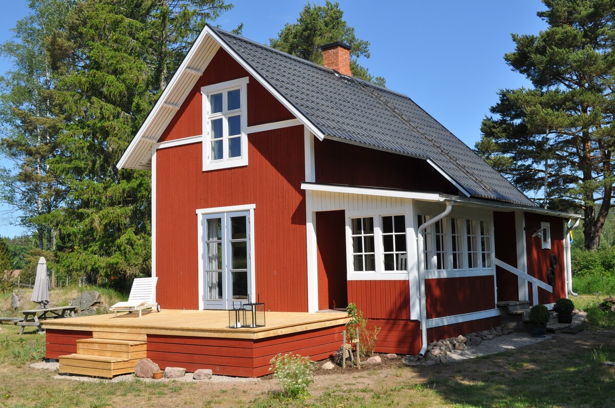 Meet our lovely red cottage in Småland surrounded by forest, hills and lakes. With all the comfort you need for a pleasant stay. Enjoy a cozy evening by the wood stove. The house has a big private garden where you can relax and make a campfire at the fire pit. Go fishing or take a swim in one of the lakes nearby. And maybe you see deer, foxes or moose from our sunny porch. Go skiing at the ski-slope, visit a moose park or go down the zippline. April-October we rent out 2 sit-on-top kayaks.