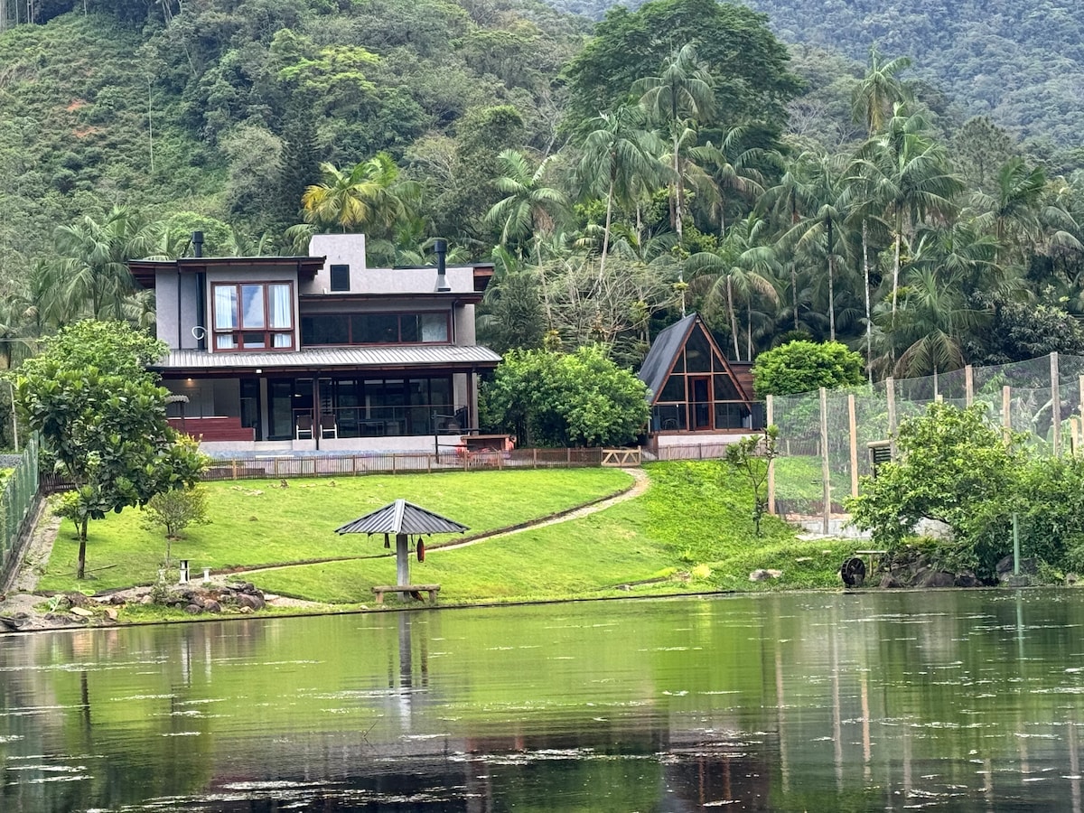 Refúgio de alto padrão na Estrada Bonita, Joinville/SC. Casa moderna com lareira, jacuzzi, área gourmet e vista para o lago. Cozinha completa, cervejeira, adega, churrasqueiras interna e externa, quadra de areia e mini-bosque. Acomoda até 6 pessoas com conforto. Para grupos acima de 6 hóspedes, o chalé anexo é disponibilizado, um espaço independente com varanda e churrasqueira privativa, garantindo ainda mais comodidade e privacidade. Próxima a cachoeiras, restaurantes e cafés da região.
