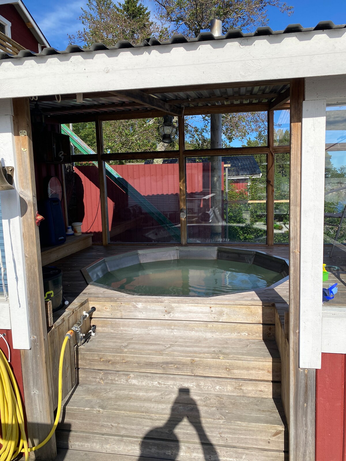 Fantastic cottage with lakefront property! Sauna, hot tub and boat with engine. Long jetty by the beach and swimming raft with diving tower. The cottage is in an area with 7 cottages but completely separated from neighbors. 5 minutes from E4. There is a 10-minute drive from the cabin. The cabin does not have electricity or running water. Fresh water is supplied during the stay with water containers Gas stove with oven and gas fridge. The hot tub available Easter- end Oct. Water hot tub ok to use during Easter - end of Oct.