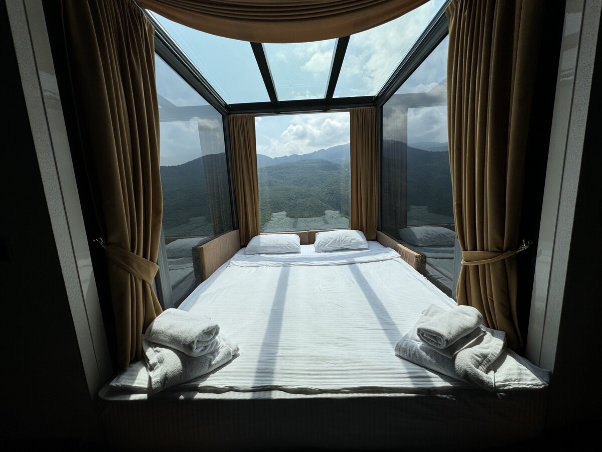 One bedroom (glass window) for 2 people Triangular two-story cabin 1st floor, living room, bathroom, kitchen (plum, blender, microwave oven, kettle, Nespresso coffee machine, dishes) mini bar A balcony with a view of the Dzor, a small wooden pool with warm water, a hammock On the 2nd floor, a glazed bedroom