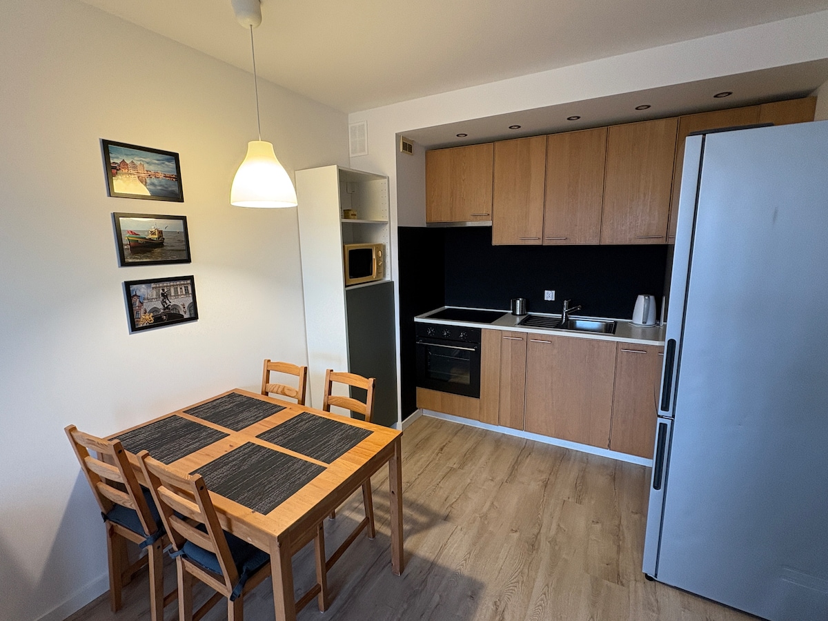 The apartment is located in the beautiful and rural Danzig district of Jasien. The apartment is located in a beautiful green area with a small lake that invites you to take a walk. At the moment there is a construction site, so there is no direct access to the lake. Nearby shopping malls offer nice restaurants and shopping opportunities. It is about 6.5 km to the center of Gdansk and 16 km to the sea. Min. There is currently a construction site.