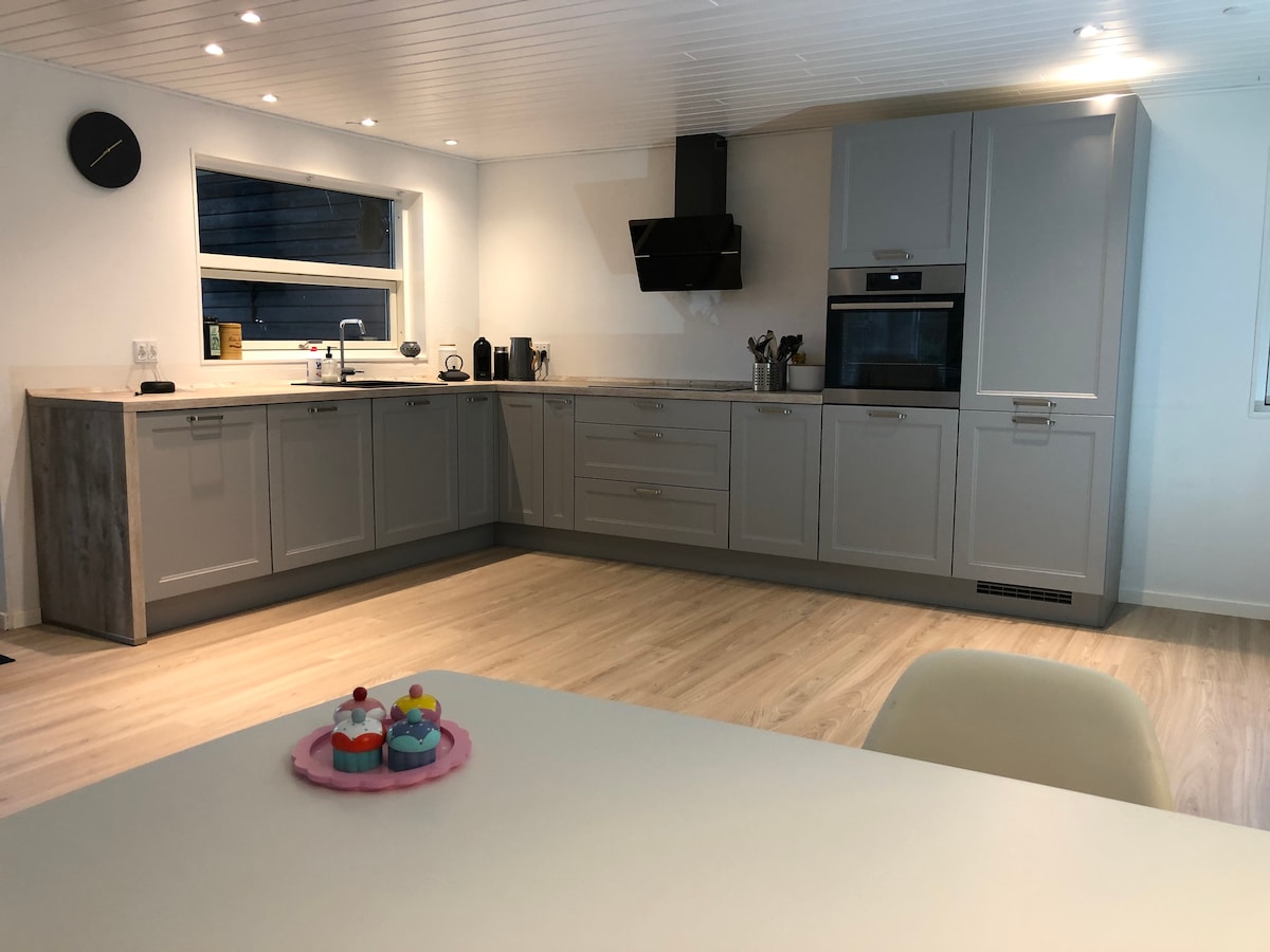 Bright and cozy house in a small village on the west coast. Close to the water with a jetty. The house has a lovely large garden with apple trees, cherry trees, plum trees as well as fig trees and courtyard with vines. There is also a campfire area, hammock, trampoline and outdoor gym. In the garden there is a caravan and a glamping tent, where there is sleeping space for 4 people. Here there is plenty of opportunity for peace and quiet for 2 families (9 beds) or just one big family. Short distance to shopping (4.5 km) and highway.