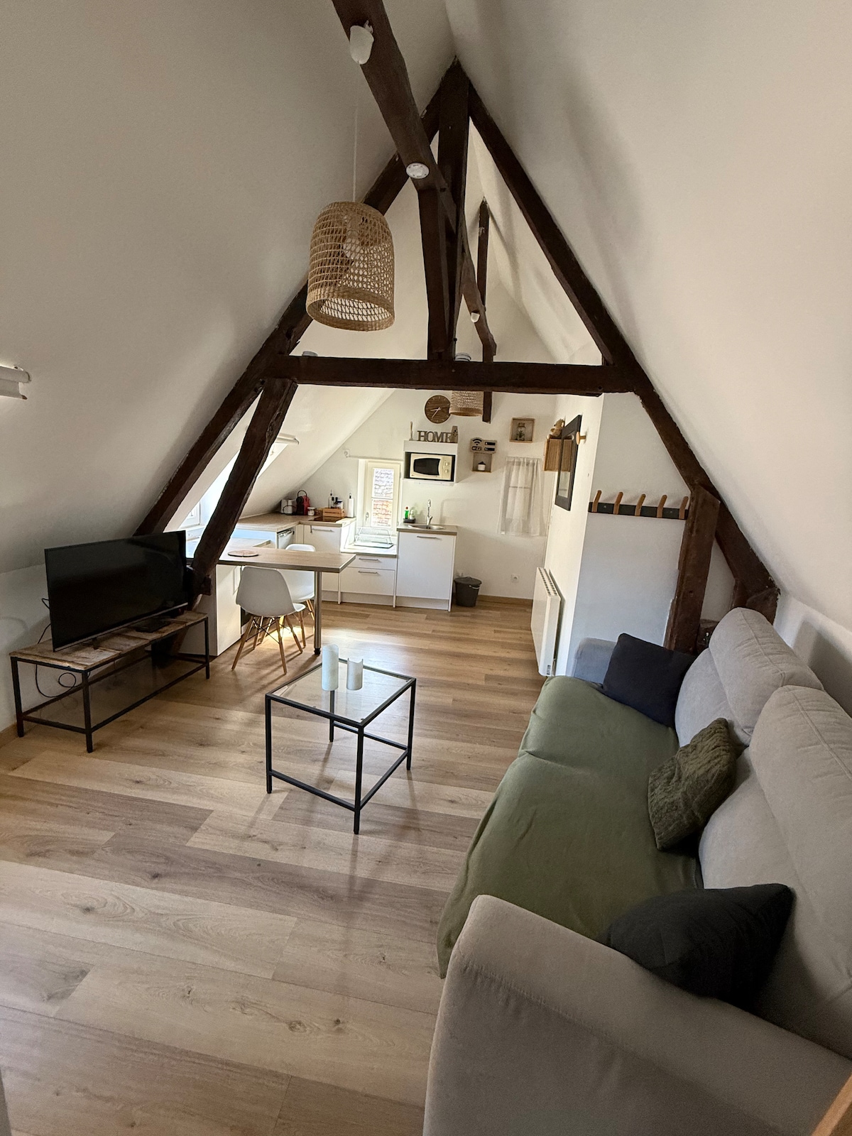 Studio in the historic district of Chartres, 3 minutes' walk to the Cathedral, all shops and less than 10 minutes' walk to the train station. Rue des Écuyers is a pedestrian street, very quiet, one of the most beautiful and typical of Chartres. Bed for 2 people and sofa bed for 2 people. Free Wi-Fi, Freebox and Netflix. Fitted kitchen with induction cooktop, combined oven and microwave, dishwasher, Nespresso, kettle, toaster. Self check-in with key lockbox.