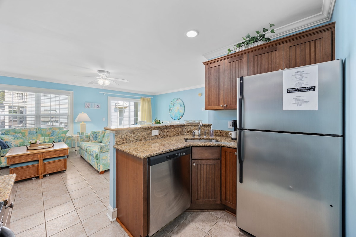 Make cherished family memories in this condo villa retreat! Our cozy condo offers a spacious living area, a serene master suite, a second bedroom, and a fully stocked kitchen. The pool is just a 3-minute walk, while a nearby restaurant and tiki bar invite you to relax with ocean breezes. Indulge in sweet treats at the ice cream shop or grab Starbucks on the go. A gate pass ensures easy beach club parking, or take a scenic 8-10 minute walk to your private beach access! 🌊☀️🏖️