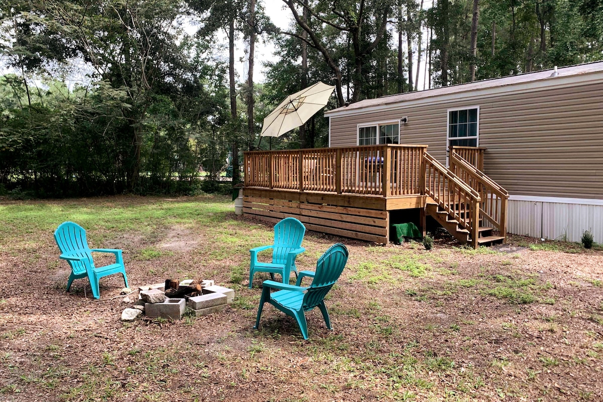 Bunkhouse with large deck under a Live Oak in Murrells Inlet. Small manufactured home with two bedrooms, full bath and furnished kitchen. There is room to bring your pop-up camper or tent and enjoy the large lot with a camp fire pit to create family memories. Wacca Wache Marina on the Intercoastal Waterway is ten minutes away, enjoy the Marshwalk in Murrells Inlet just 3.5 miles away and we are located 15 miles south of Myrtle Beach.