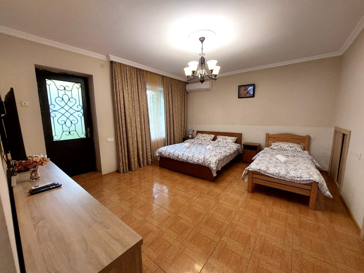 Our house is near the wood, (but It's 15 minutes from the centre by walk). So, you can feel cool and fresh air. From the balcony, you can enjoy the picturesque view of Caucasian mountain range. Our house is perfect for anyone who wants to discover traditional atmosphere of Georgia, feel relaxed around the forest of pine, and enjoy big garden with nice flower-beds and vineyard. We can offer to taste delicious Georgian wine.