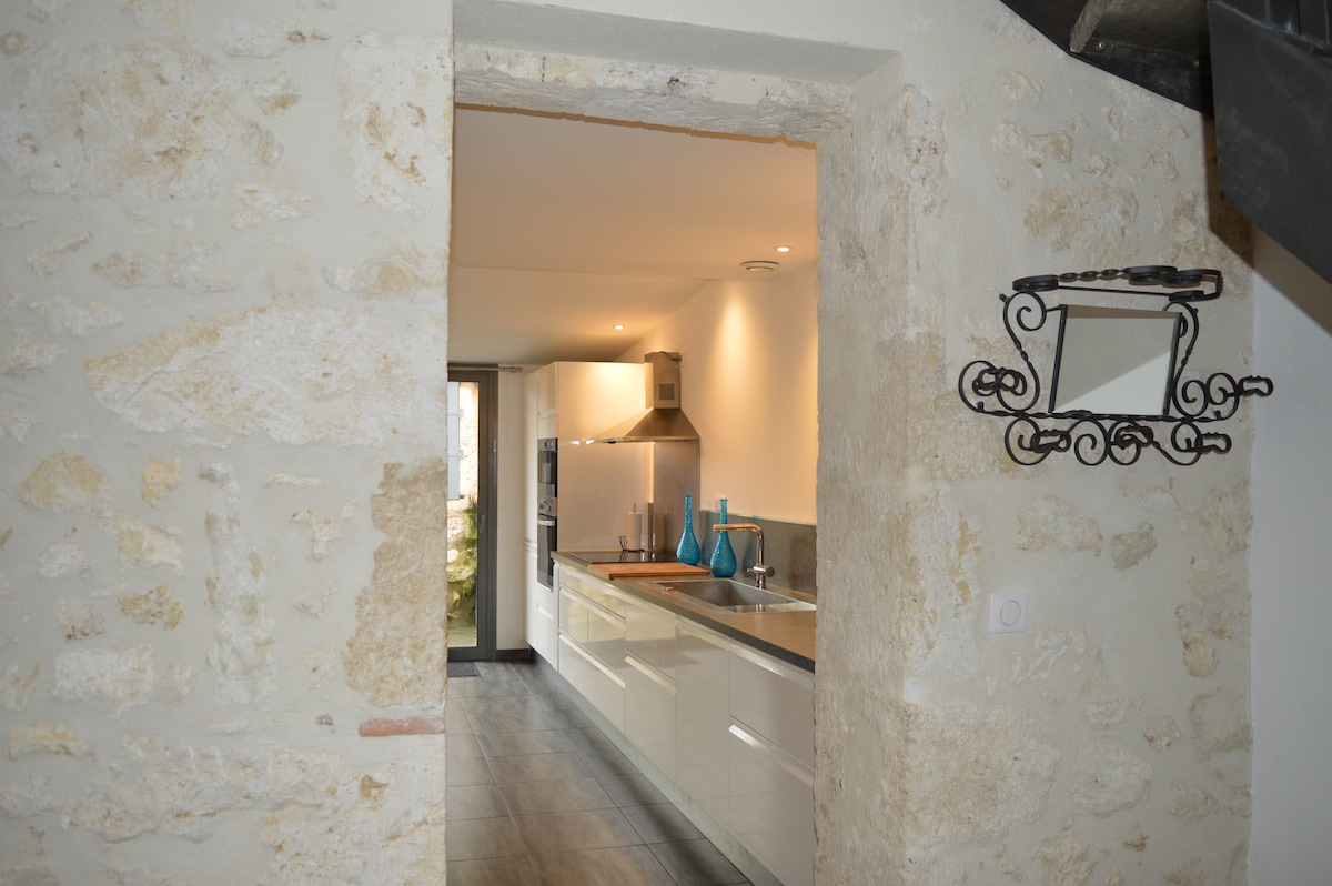 Gers townhouse ideally located in the heart of the city in a small dynamic village which is also a stopover village. 50 m walk to all shops. Fully equipped kitchen with dining area (approximately 20 m2). The first floor, 16 m2 attic, is composed of a quality sofa bed, a 1st toilet and a shower. Extra bedding is also available; a TV area. The 2nd floor is a bedroom with toilet, water point and desk. Cozy and cozy atmosphere...