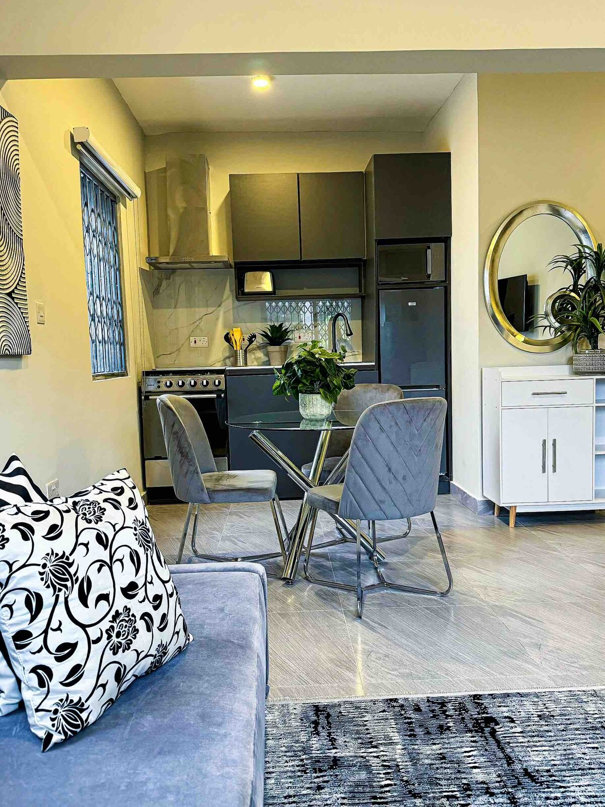 Welcome to your private 1-bedroom guesthouse in Cantonments, one of Accra’s most secure and desirable neighborhoods. This modern retreat offers a bright bedroom with queen bed, cozy living area with smart TV, sleek bathroom with hot water, and a fully equipped kitchenette. With air conditioning, reliable high-speed WiFi, and 24/7 security, you’ll enjoy both comfort and peace of mind. Just minutes from embassies, restaurants, malls, and Kotoka Airport.