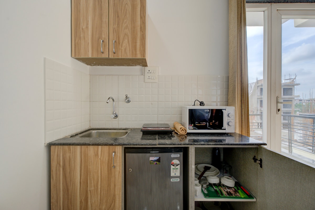 Premium 1BHK Service Apartment in Sector 43, Gurgaon with AC in living room & bedroom, plus a kitchenette with induction, microwave & cutlery. In a posh area, walking distance to Gold Souk Mall & Shalom Hills School, 2.2 km from Millennium City Centre Metro & 2.1 km from Fortis Hospital. Foreign guests are welcome. Early check-in will be subject to availability and chargeable Rs.500 as well as late checkout will also be the same with ₹500 added for every 3 hrs thereafter.
