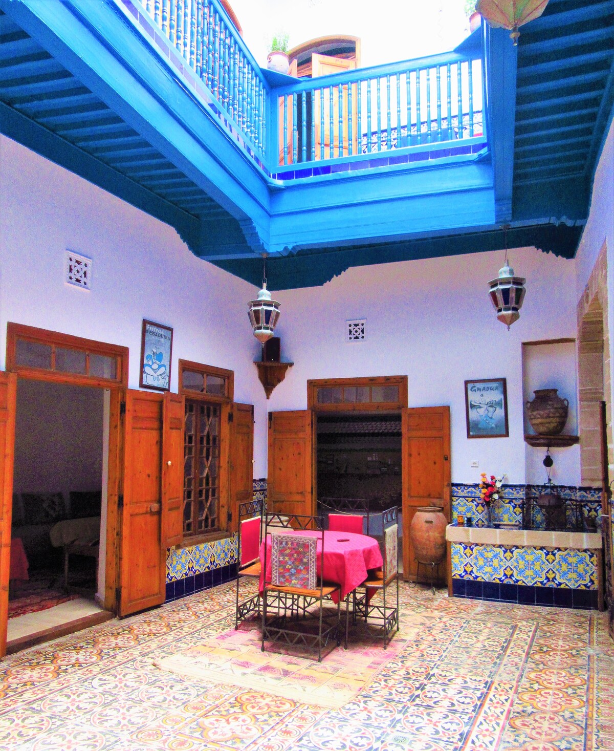 The Ory house, "Dar Ory" is nestled in the heart of the bustling Essaouira medina. Recently renovated, it is a typical house of Moroccan medinas: organized around a central patio with a rooftop terrace. It is a peaceful haven where you can come to rest and unwind after surfing, kite surfing, wing surfing or windsurfing sessions; or after a stroll through the swirling medina of Essaouira.