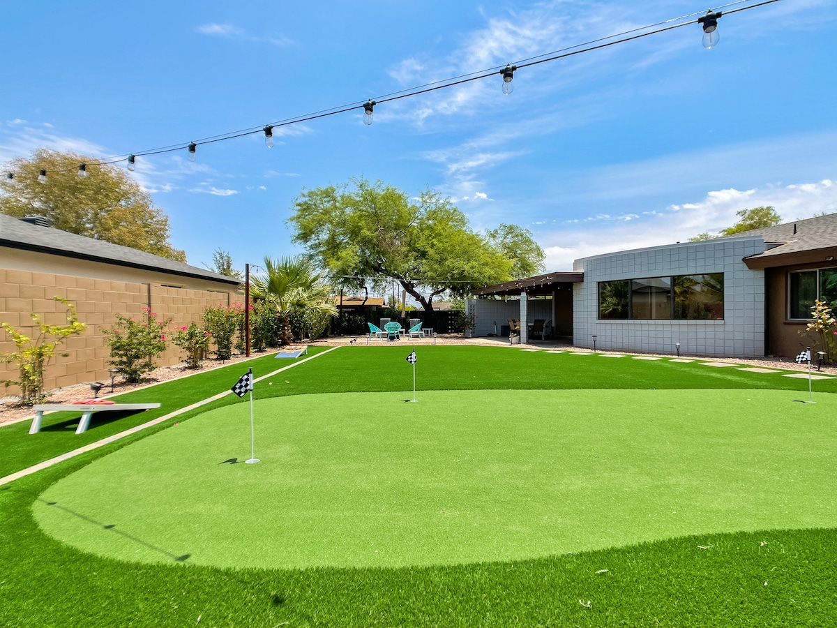 Welcome to the mid-century modern home that is spotless & in a safe neighborhood. Your Scottsdale retreat includes a stunning backyard w/ Hot Tub, putting green, large play area, fire pit, lounge space and fun games! PELOTON, yoga and weights. Fast WIFI, Smart Roku TVs, home office setup. Centrally located to attractions and quick access to entertainment hotspots and golf. Heading indoors you will be greeted by 4 spacious bedrooms and a chef’s kitchen to share food, love and happiness