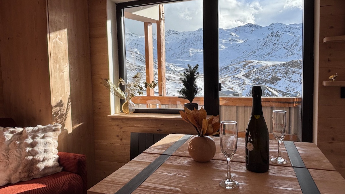 Renovation carried out in summer 2024. 1 bedroom: 1 double bed + 1 single bed Living room: 1 double sofa bed or 5 places in total. 30 m apartment, southwest facing in a small 3-storey residence with a terrace overlooking the children's ski and toboggan runs. Located in the heart of the 3 Valleys, in Val Thorens, in the center of the resort, on the plateau of Place Caron in a cul-de-sac. Cleaning and linen included in high ski season but not included in low season off ski