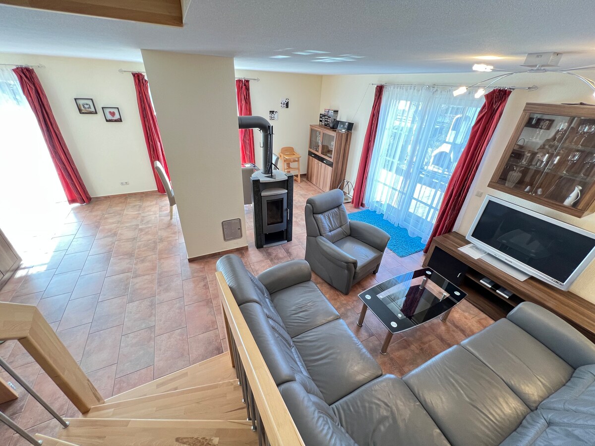 Furnishings: Charming, rustic alpine/Mediterranean furnishings, 2 bedrooms, 2 bathrooms (1 bathroom on the ground floor with sauna and shower, 1 bathroom on the upper floor w/ shower and classy bath tub), 1 kids' room. Big kitchen with luxury electrical appliances from Miele, Bullerjahn fireplace, TV, BOSE soundbar, large terrace, balcony, relaxation chairs, garden shed, 2 car parking spaces, BBQ, green garden for badminton. 1.5 km to the beach and 500 m to the Achterwasser. Private jacuzzi.