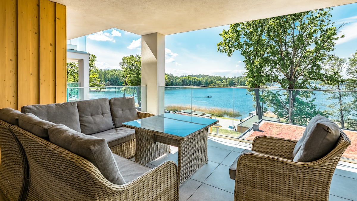 Masuria is a beautiful region of Poland where natural lakes surround us on all sides. For us, contact with the ubiquitous Masurian nature is especially important. That's why only six houses are located on a large area at comfortable distances for guests. The glass in the living room and the spacious terrace provides unique views regardless of the time of day or year (the houses have a fireplace and central heating). The shared area consists of extensive lawn areas and a vegetable garden.
