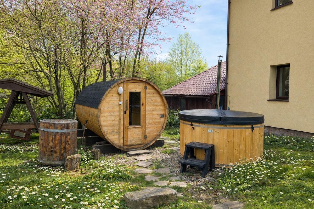 Come and relax from the hectic life in our cottage in the heart of Podkrkonoší. All comforts from hot water to air conditioning are a matter of course. The glass terrace allows you to enjoy the surrounding beauty of nature from the comfort of the interior. Here you can enjoy a morning coffee or a romantic dinner. There is a fully equipped kitchen and an outdoor grill. And wellness? Forget all your worries in our outdoor year-round hot tub under the open sky!