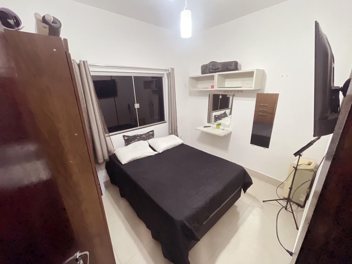 Pleasant 1-bedroom private studio-type accommodation. Set up with great care, it offers everything you need for a comfortable stay. It has a full kitchen, split air, Smart TV, Wi-Fi and a private service area with a washing machine, sink and clothesline. We are located in Jardim Nova Esperança, northwest region of Goiânia. A typical residential neighborhood with a variety of convenience and leisure options available.