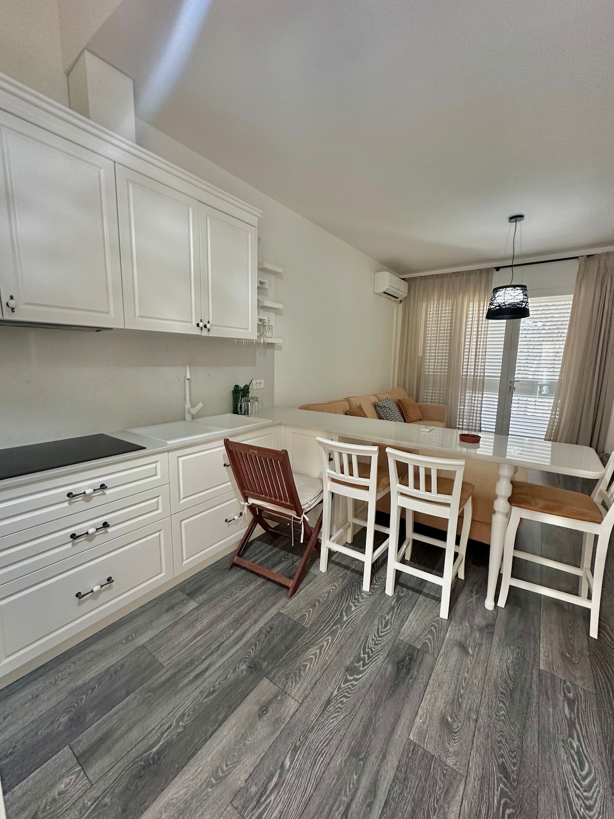 Enjoy a spacious and elegant 95m² family apartment in Golem, just minutes from the beach. Designed for comfort with 2 bathrooms, 3 AC units, smart TV, dehumidifier, and a cozy fireplace. The master bedroom features an in-room bathtub. A fully equipped kitchen with indoor grill and a private yard with outdoor shower make it ideal for families seeking style, space, and coastal relaxation.