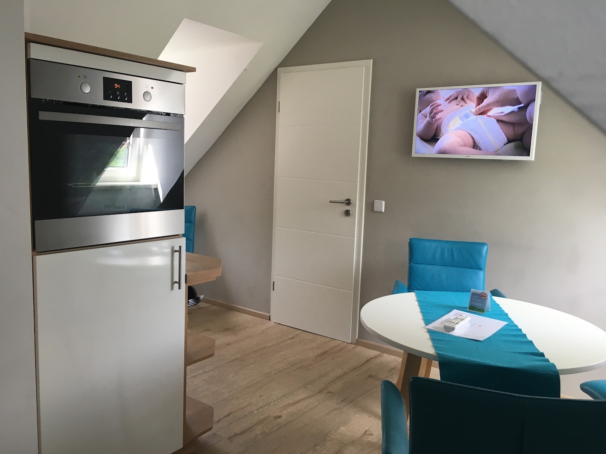 Located in the city center of Altenburg. Handicapped accessible/elevator/large double bed/sofa bed/2x satellite TV/Wi-Fi included/ Pergola (balcony)/ modern fully equipped kitchen with dishwasher, stove, microwave, fridge, Nespresso coffee machine and washer-dryer/ Ambilight/ rain shower/ 2.1 sound system and much more Breakfast in the neighboring hotel possible/beverage service possible/cleaning service possible/parking space in the in-house underground car park possible/towels & bed linen included.